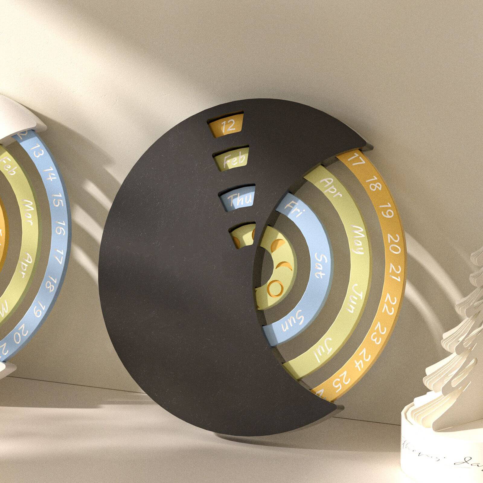 Featuring a sophisticated rotating design, this set creates an 8.5″ diameter calendar wheel with interchangeable date, month, and day displays in soothing pastel colors. The matching cover piece adds an artistic element while revealing the current date through elegant cutouts.
