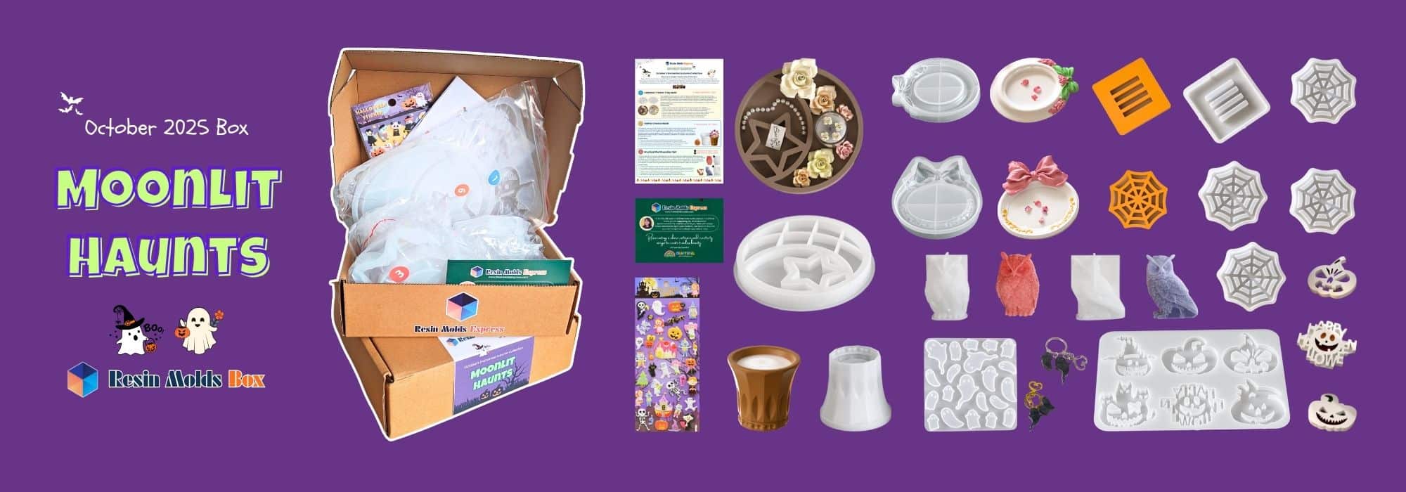 We are officially diving into the spooky season! This month’s Resin Mold Box theme is the absolutely enchanting “Moonlit Haunts,” which is part of the October’s Enchanted Autumn Collection. Get ready to celebrate the bewitching season with a collection of seven versatile mold sets that perfectly blend spooky charm with practical elegance!